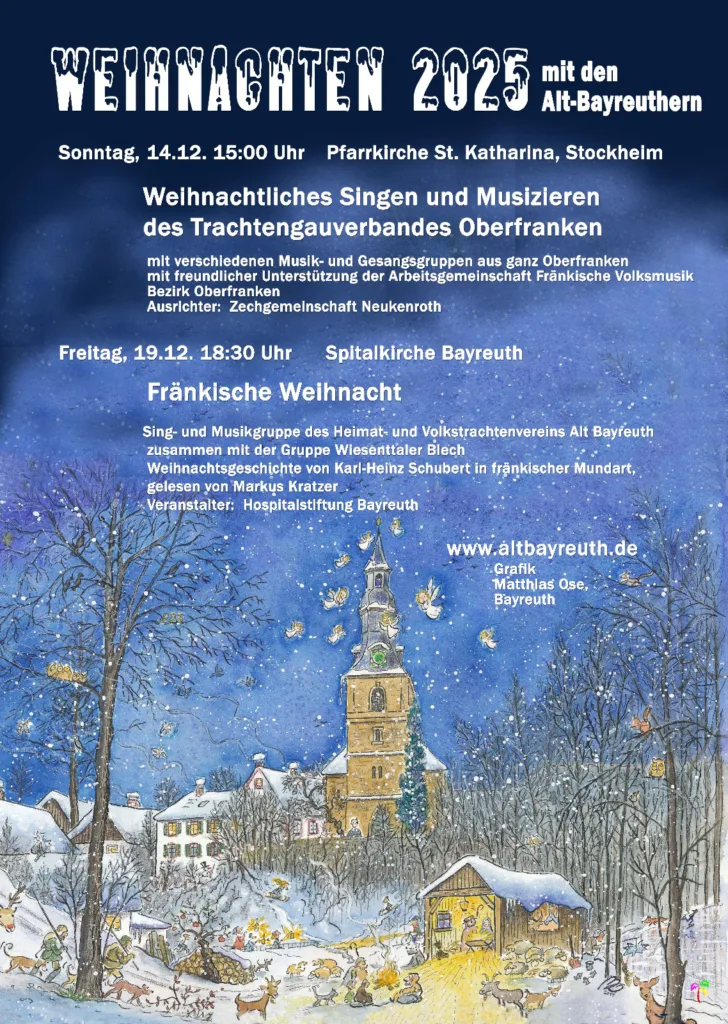 Ihr könnt uns am 14. Dezember beim Weihnachtlichen Singen und Musizieren des Trachtengauverbandes Oberfranken in Neukenroth erleben.